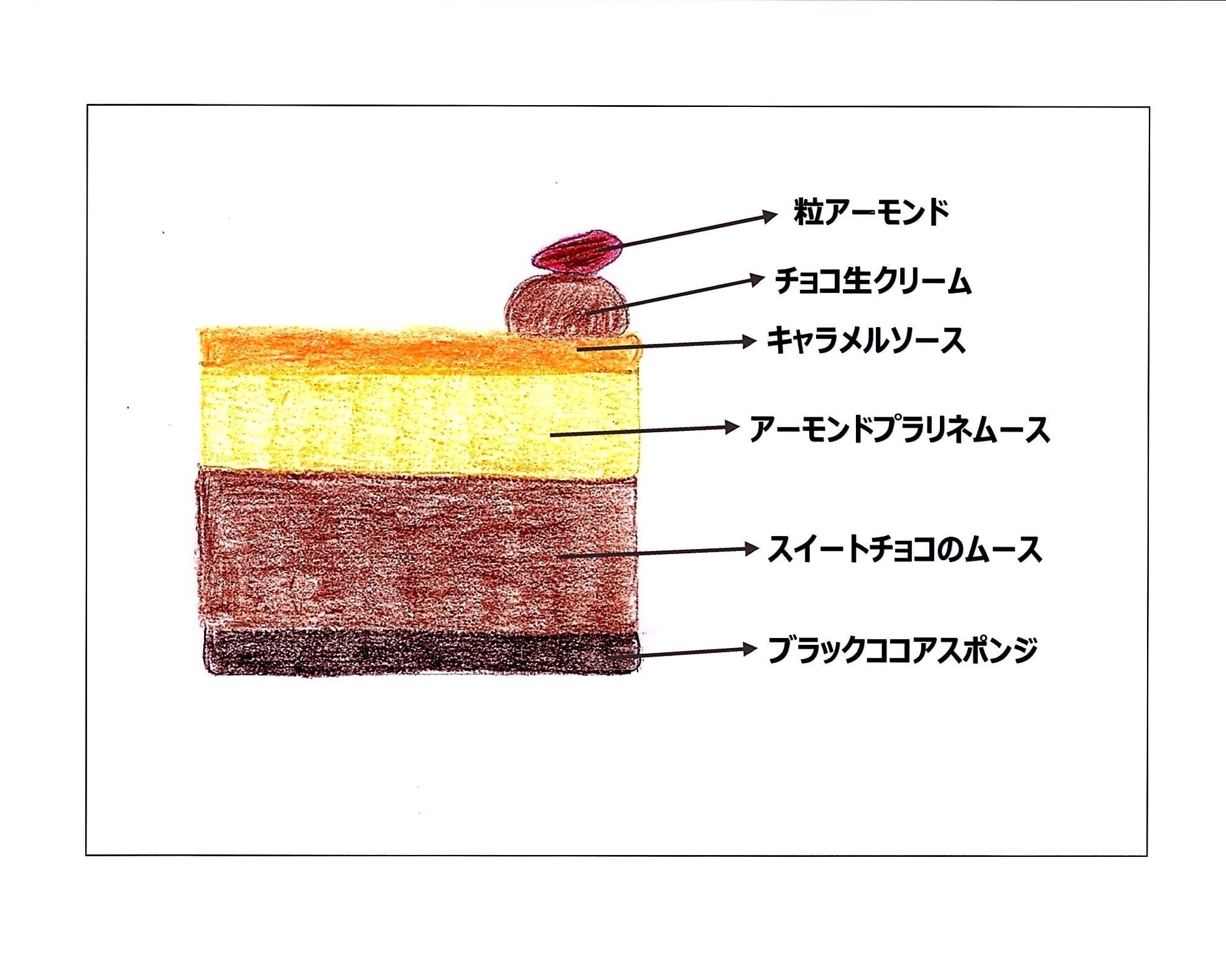 一番上はキャラメルソース、その下はアーモンドムースとスイートチョコの二層のムース。